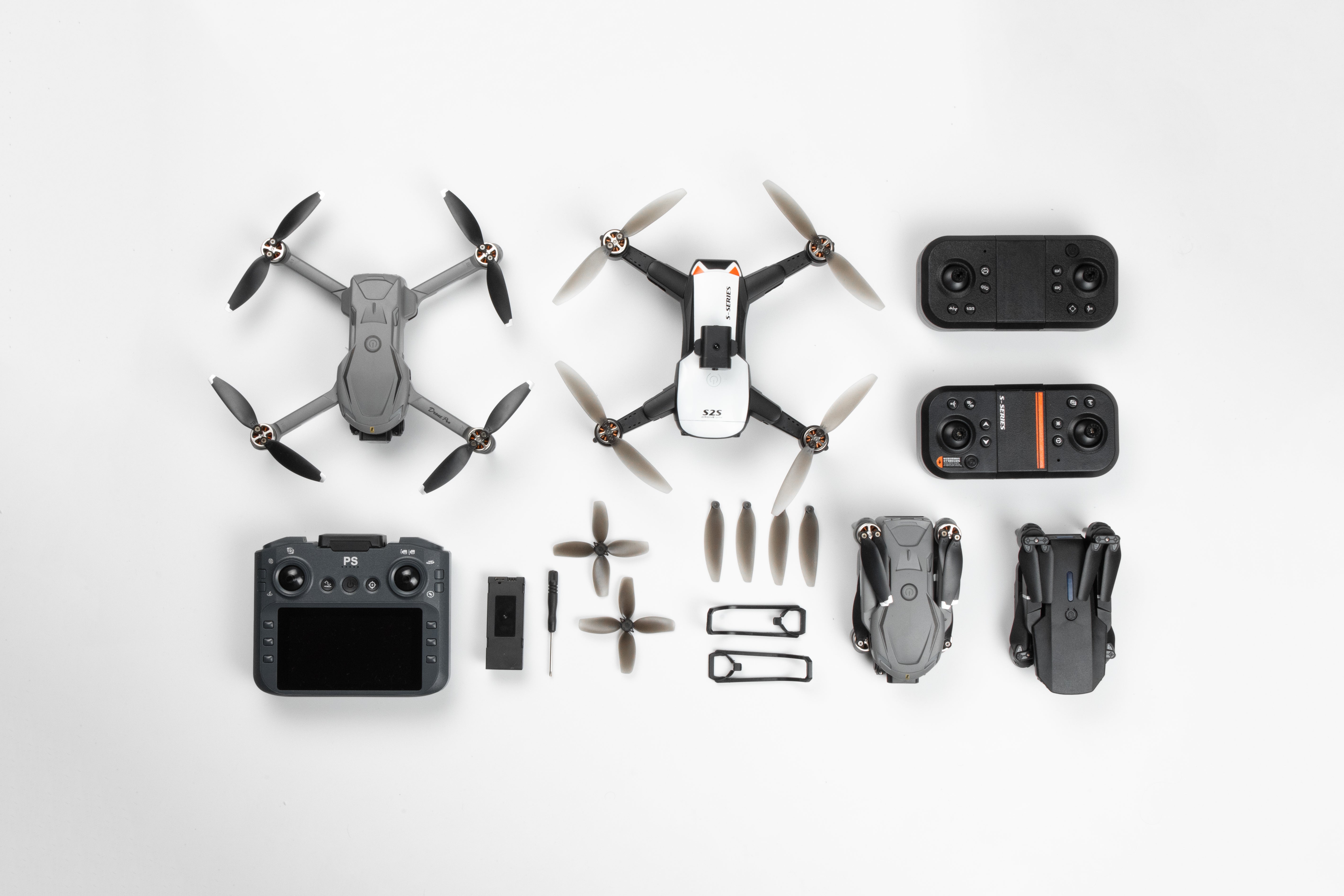 Drones come with a protective carry bag to keep your gear safe and organised. Inside you’ll find the drone, remote controller, spare propellers, guards, tools, charging cable, and battery.